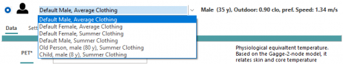Depending on the Thermal Comfort Index to be simulated, a number of personal parameters of the simulated person can be selected. The most options are available with dPET and PET, which allow not only to set the clothing and level of activity, but also the sex, height, weight and age of the simulated person. For UTCI, SET and PMV these parameters are ignored and only a standard person according to ISO 7730 (35 years, male, 1.8 m tall) will be considered in the simulation.
