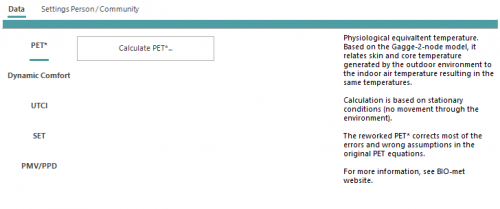 Finally, you have to decide which Thermal Comfort Index should be calculated by BIO-met. The available static indices are PET* (recommended), UTCI, SET and PMV/PPD (not recommended). For simulating Dynamic Thermal Comfort, a separate tool will be launched for which an individual guide will be available soon.