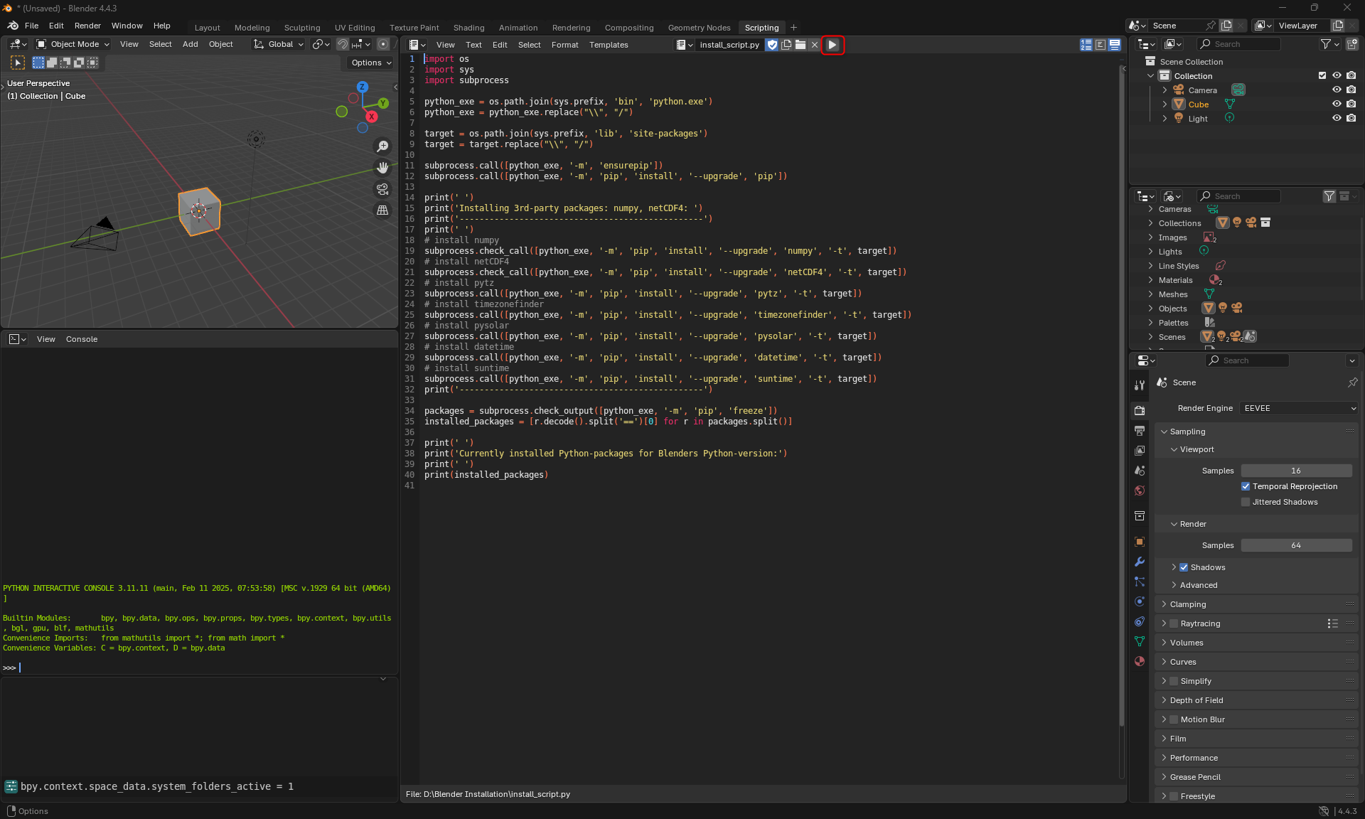 - Run the script: Either Alt+P or click the play button in the top row of the Scripting menu. Note: If you open the Blender system console you can check if the installation was successful. You should either see something like “Requirement already satisfied” or “Successfully installed cftime-x-x-x netCDF4-x-x-x numpy-x.x.x. The script also prints all currently installed python-packages. Thus, you can double-check if the installation was successful.