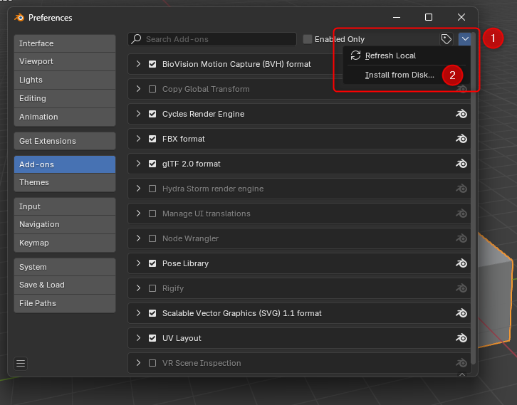 - Activate the ENVI-met Importer by checking the checkbox (If the Add-on is not automatically selected, search for “ENVI-met Importer”).