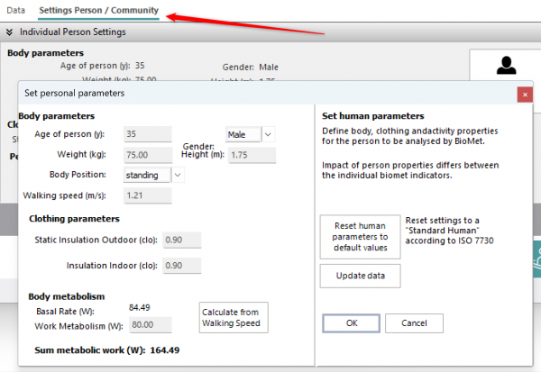 If you want to create individual reference persons, go to the Settings Person/ Community tab to see and edit the body and activity parameters.