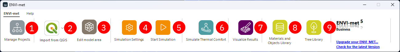 The ENVI-met Tab includes the remainder of the ENVI-met Software Suite programs. They are the essential tools needed for simulating, editing, visualizing and post-processing your model.