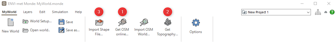 As a first step, similar to most other programs of the ENVI-met Suite, you should select the project you are working in (1). Before creating a new map in Monde, you will need to setup your geographic location. You can do this via the World Setup button (2) in the MyWorld Tab. Here, you can assign a name to your map and define a location in UTM coordinates. This is important if you e.g. load OSM data into your map and for the simulations later on. When importing shapefiles which already have a geographic reference, you do not need this step.
