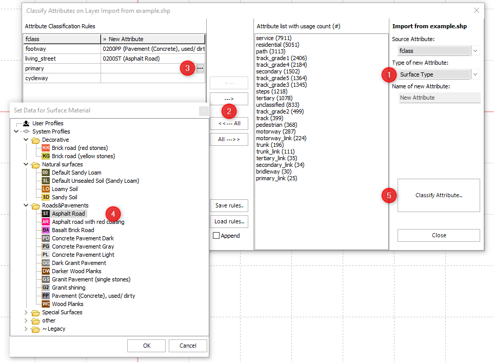 If you right-click on e.g. a GIS layer and choose “Classify Attribute…”, the below dialogue will open up. Here, you can choose a source attribute you would like to use to assign the ENVI-met attribute to. You also need to define what type of attribute it is (e.g. surface) and can give your layer a name (1). You then need to move all attributes you would like to define from your Attribute List to the list of Attribute Classification Rules on the left-hand side (2). Here, you can open a view of all materials included in the database (3) and assign the respective material (4). When you have repeated this with all attributes, you can click “Classify Attribute” and the allocation will be saved. You should define all attributes in your list as undefined attributes might otherwise be missing in your model area.