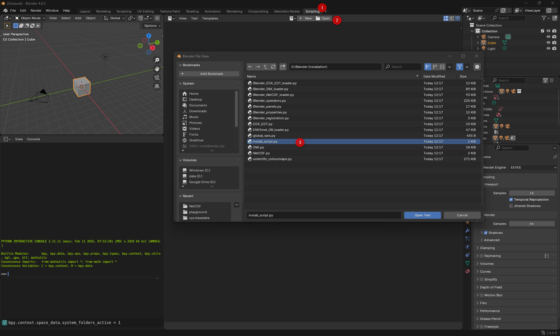 - Run the script: Either Alt+P or click the play button in the top row of the Scripting menu. Note: If you open the Blender system console you can check if the installation was successful. You should either see something like “Requirement already satisfied” or “Successfully installed cftime-x-x-x netCDF4-x-x-x numpy-x.x.x. The script also prints all currently installed python-packages. Thus, you can double-check if the installation was successful.